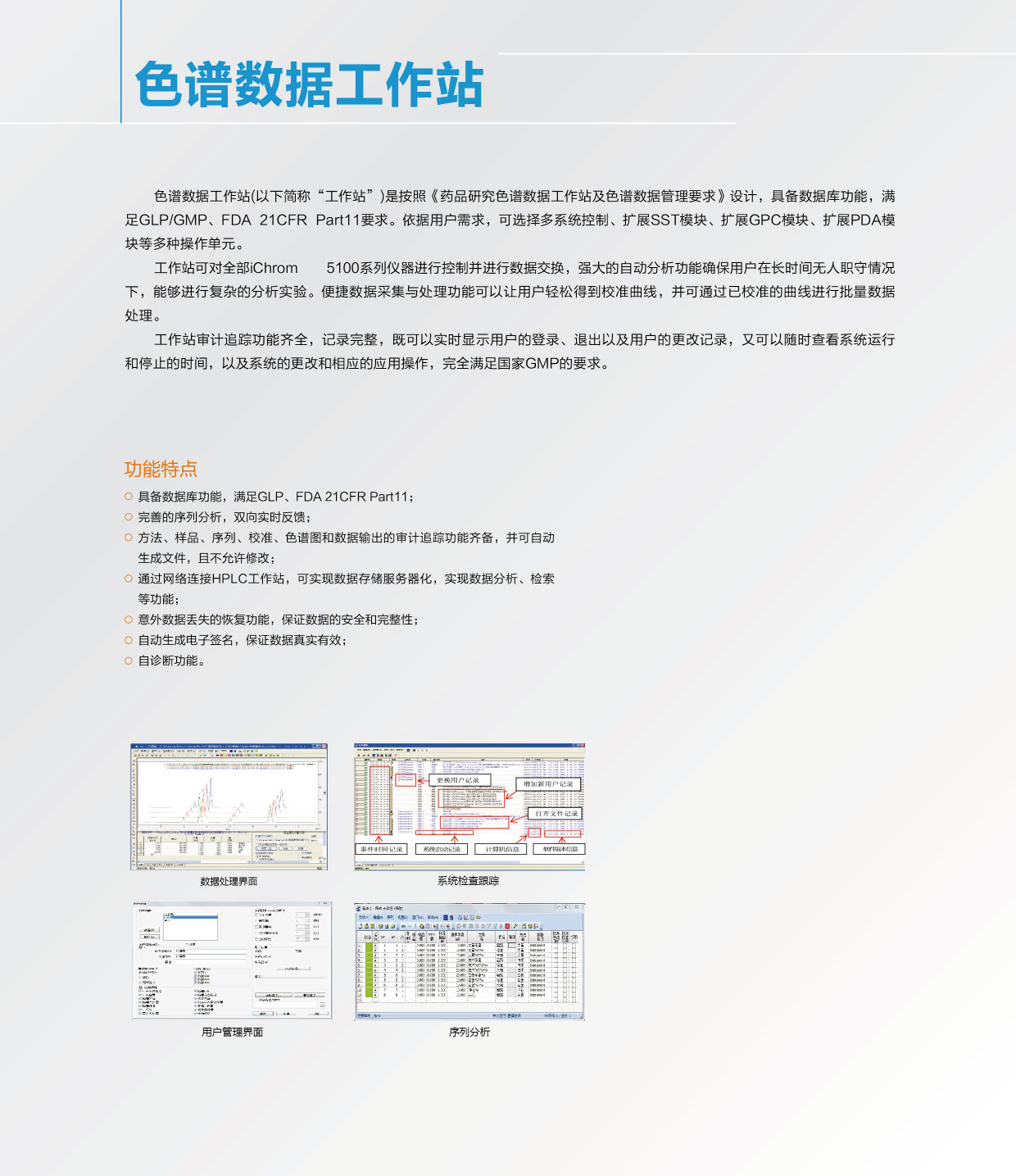 色谱数据工作站是按照《药品研究色谱数据工作站及色谱数据管理要求》设计,具备数据库功能,满足GLP/GMP、21CFR Part11要求。依据用户需求,可选择多系统控制、扩展SST模块、扩展GPC模块、扩展PDA模块等多种操作单元。色谱数据工作站审计追踪功能齐全,记录完整,即可以实时显示用户的登录、退出以及用户的更改记录,又可以随时查看系统运行和停止的时间,以及系统的更改和相应的应用操作,满足国家GMP的要求。